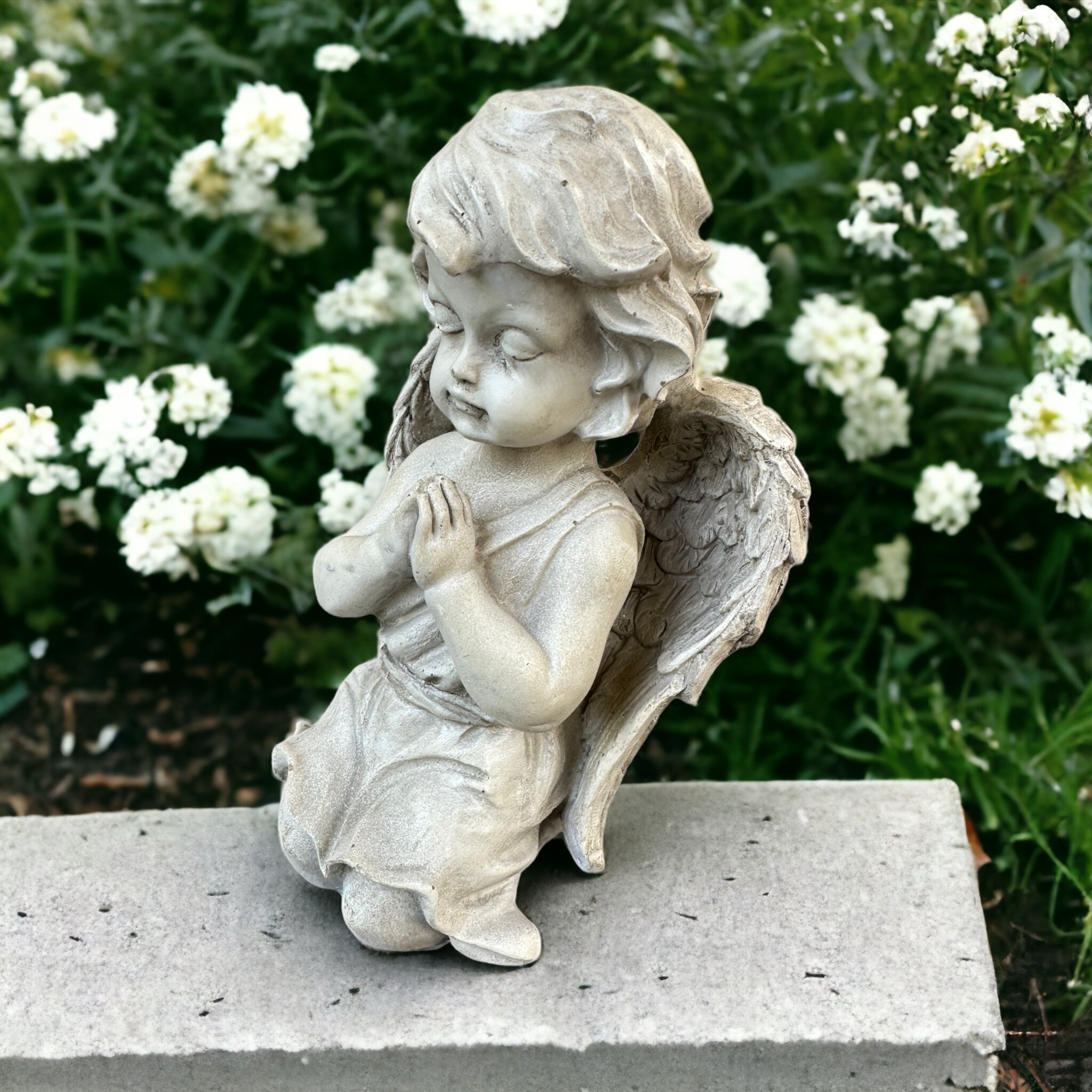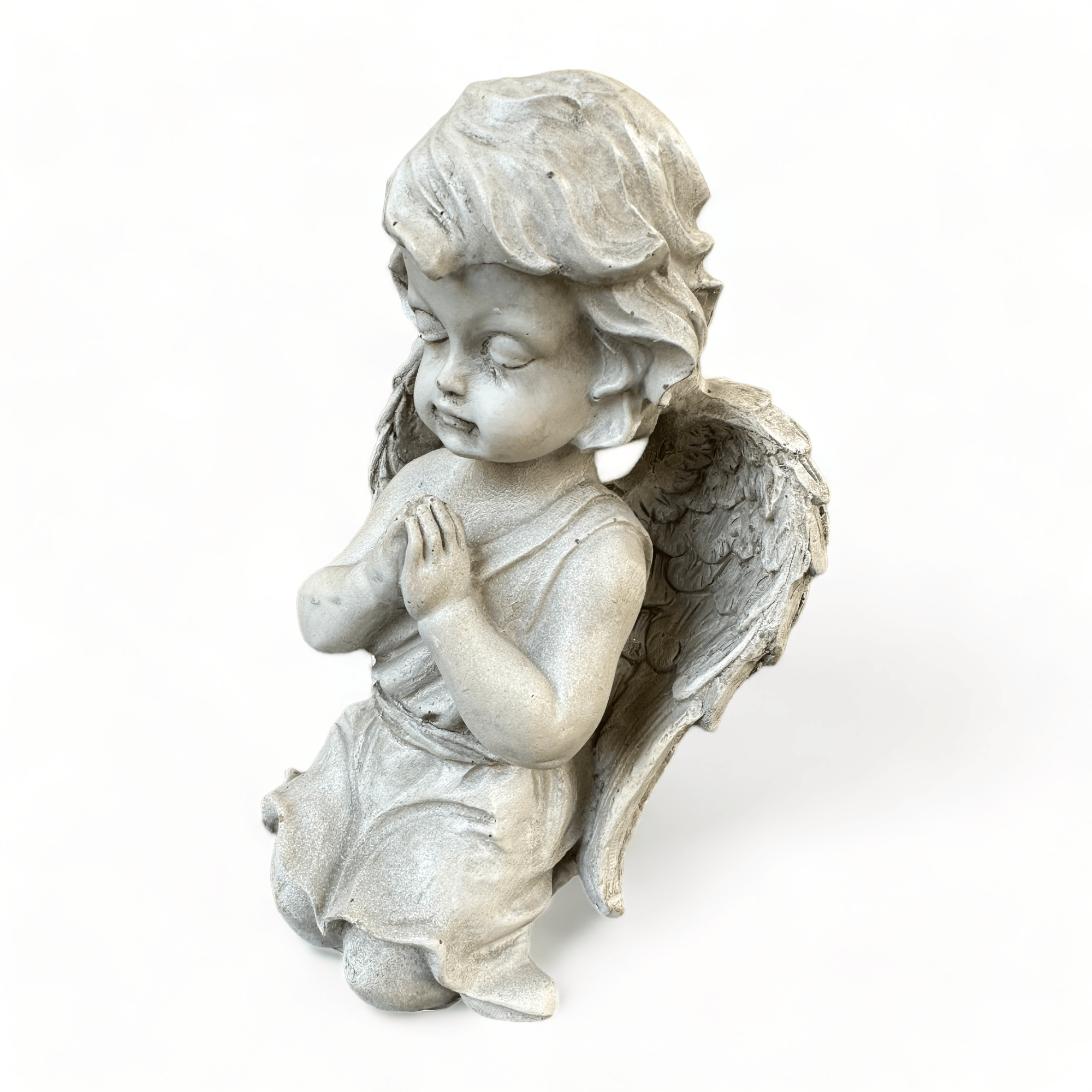 Ein liebevoll gestalteter, knieender Engel in edlem Antik-Weiß, gefertigt aus hochwertigem Polyresin. Mit seinen fein ausgearbeiteten Flügeln und sanften Gesichtszügen strahlt er Ruhe, Schutz und Geborgenheit aus.