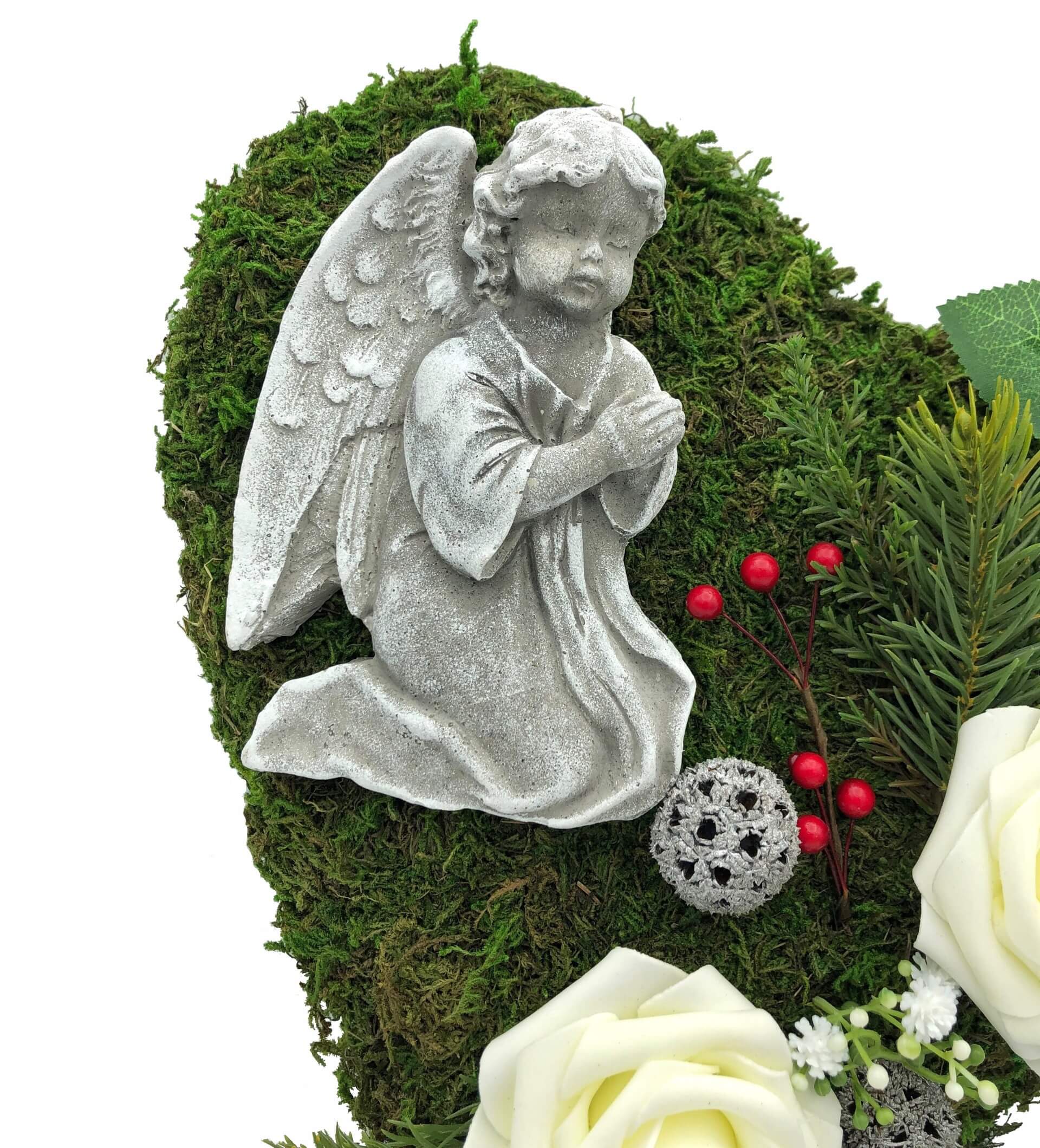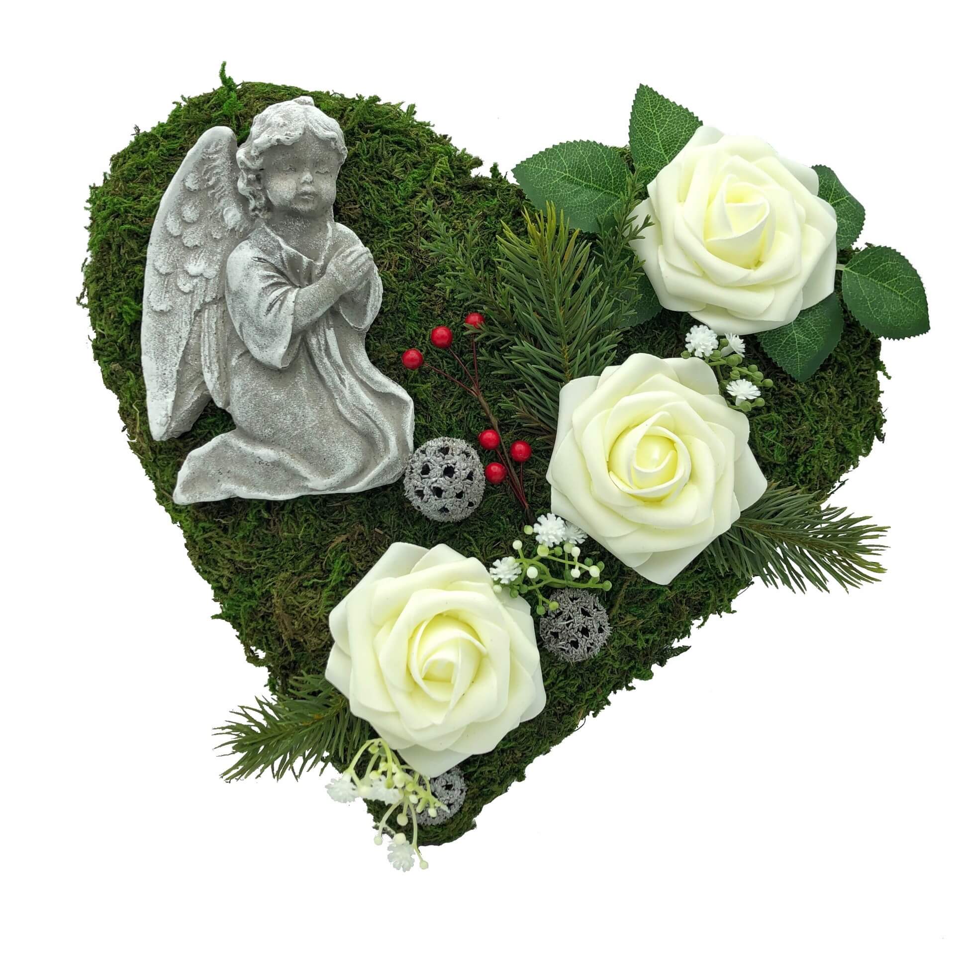 Liebevoll handgearbeitetes Gesteck Moos Herz mit 3D Engel (Handarbeit) weiße Rosen und diversen Zweigen.