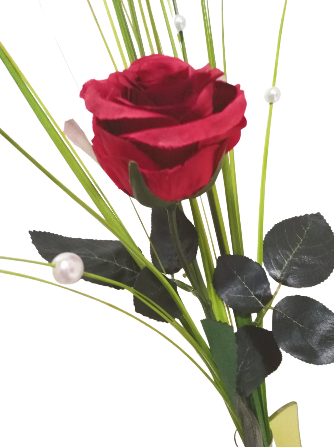 Liebevoll handgearbeitetes Gesteck mit roter Rose und Perlen.